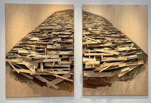 Le mécénat de la Maison Ruinart mettait à l’honneur des compositions .de l’artiste japonais Tadashi Kawamata qui, dans sa série Destruction, explore la fragilité de nos habitats et évoque les cycles alternés de construction et de destruction.